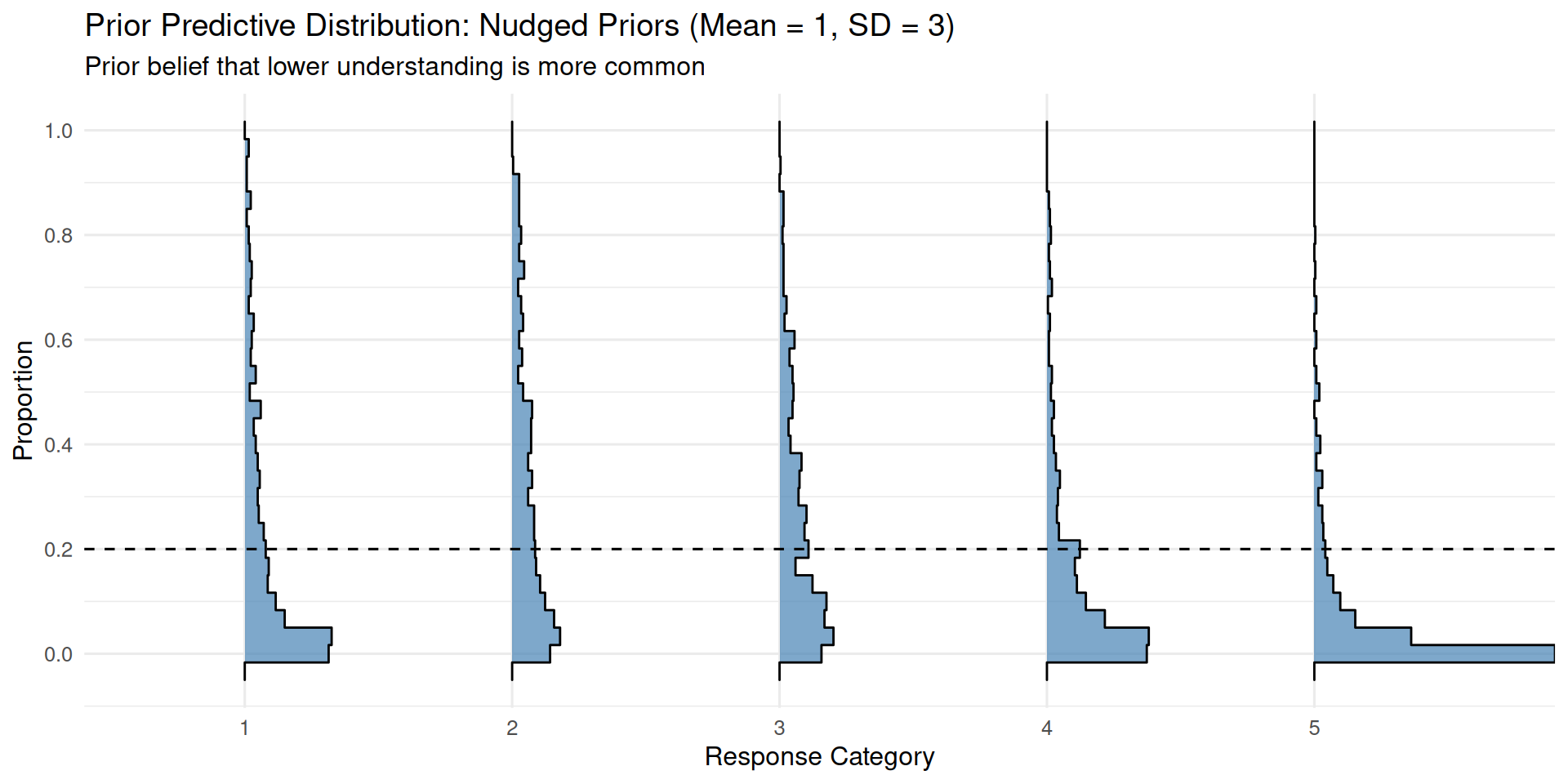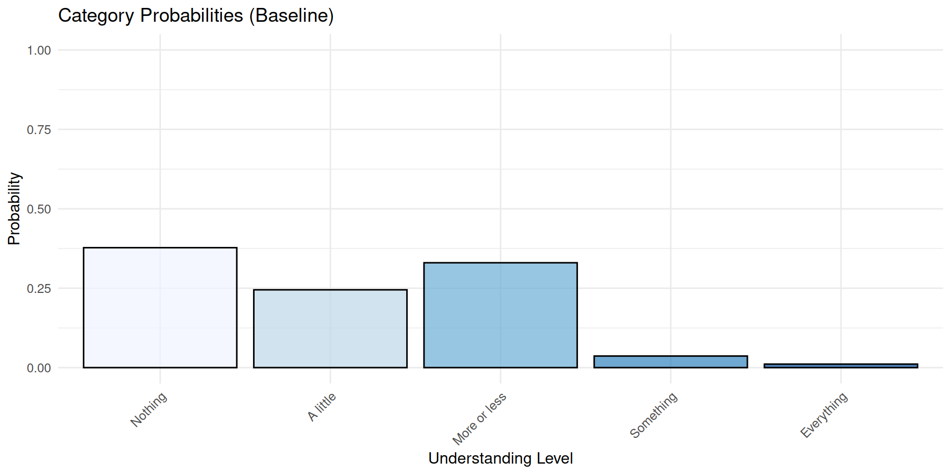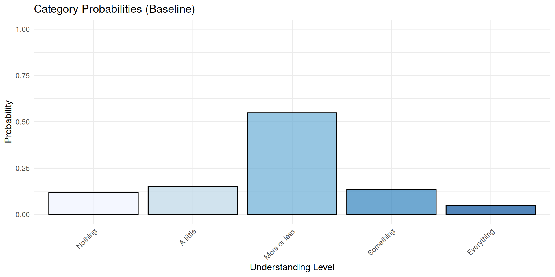 Notice how shifting the thresholds rightward decreases the probability of higher categories (more understanding) while increasing the probability of lower categories.
