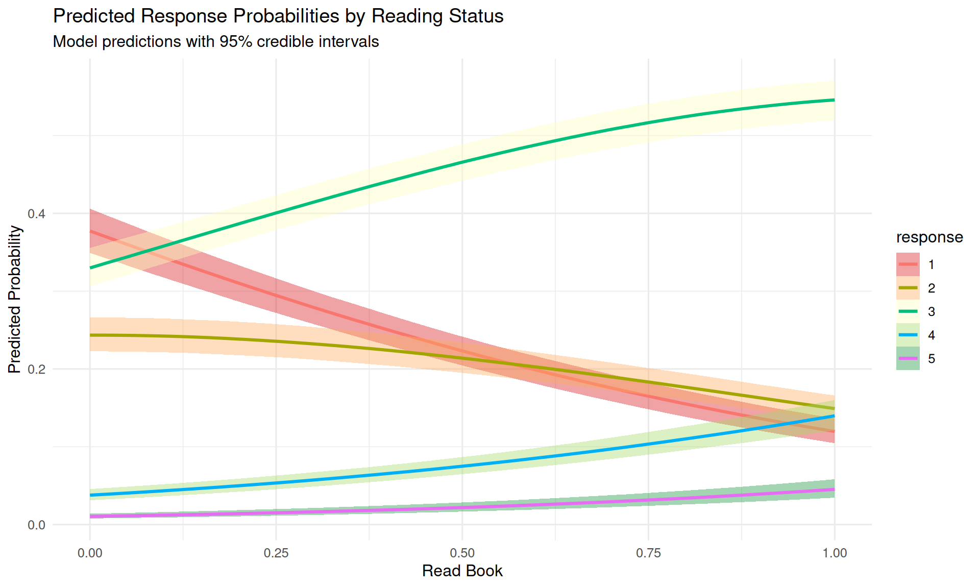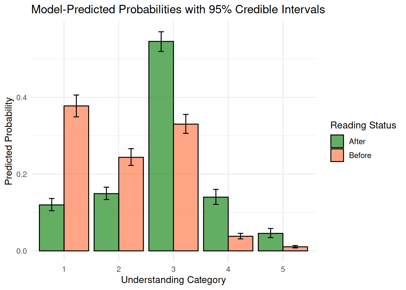 The fitted probabilities show concrete estimates: for instance, before reading, the probability of responding “nothing” is about 0.38, whereas after reading it drops to about 0.12. Conversely, the probability of responding “everything” increases from about 0.01 to 0.05.