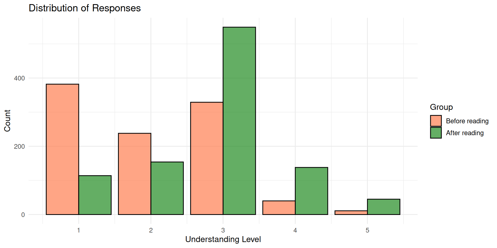In an ordinal regression with a cumulative link, our goal is to understand how a latent variable \(\tilde Y\) shifts based on predictors or interventions. Suppose we want to assess how reading a book about Bayesian modeling3 affects responses to our understanding question.