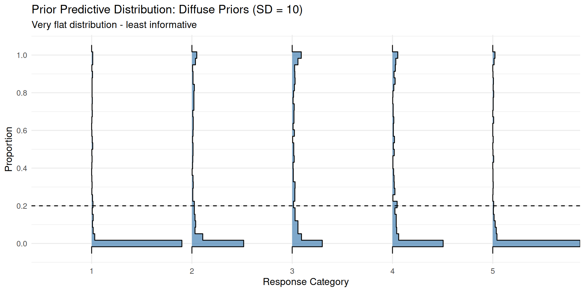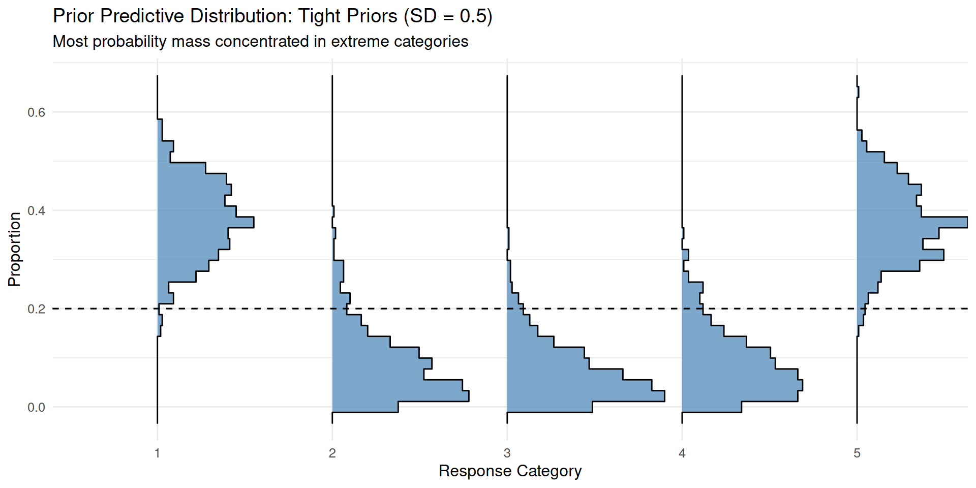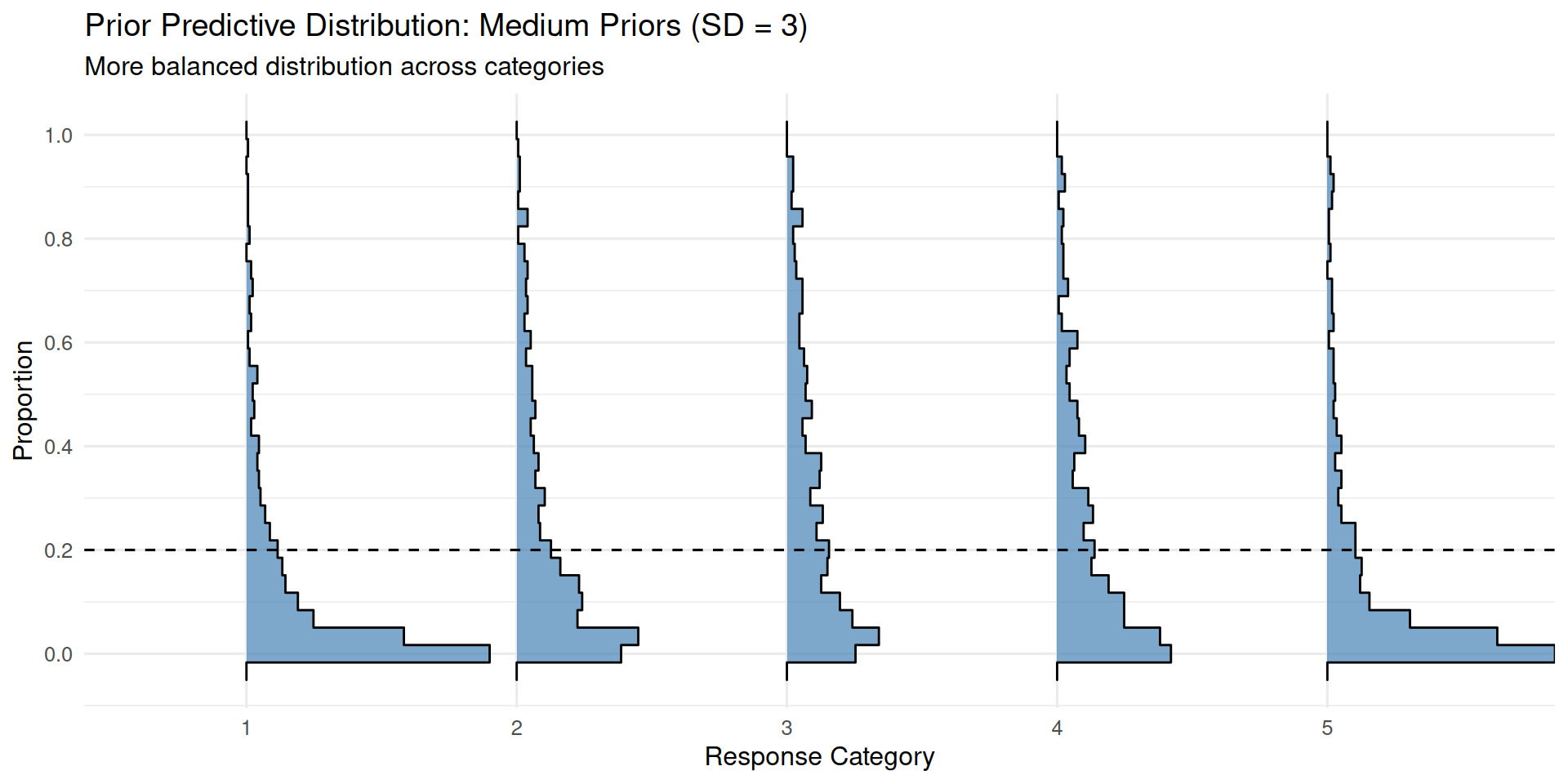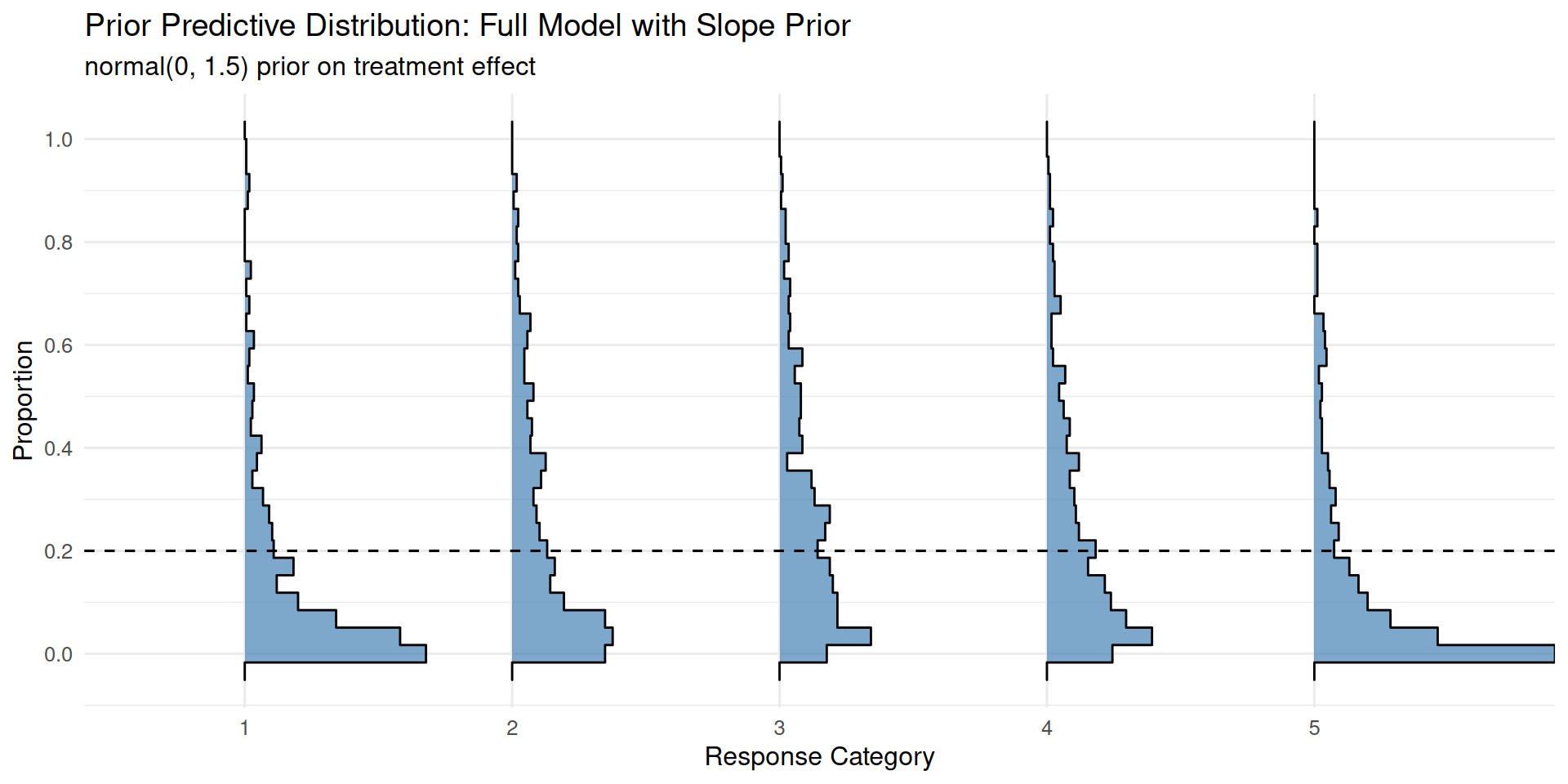 This post explains some nuances of Bayesian ordinal regression with cumulative links and focuses on how to set sensible priors.1 These models are appropriate for modeling data where the dependent variables are ordered responses without meaningful metric distances, such as Likert scales. The presentation builds on Bürkner and Vuorre (2019), but restricts attention to cumulative models.