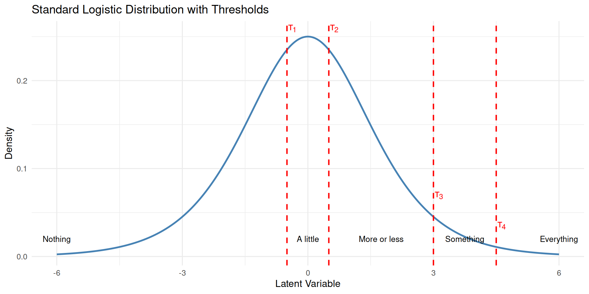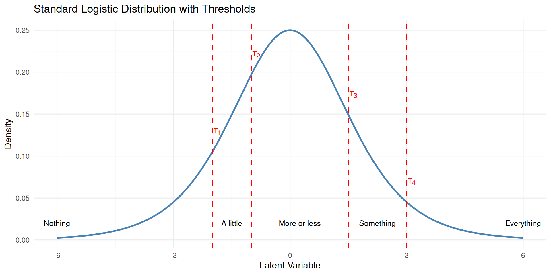 Consider a 5-point Likert scale assessing understanding of Bayesian statistics with options: “nothing,” “a little,” “more or less,” “something,” and “everything.” This scale requires 4 thresholds. The probability for each category corresponds to the area between: